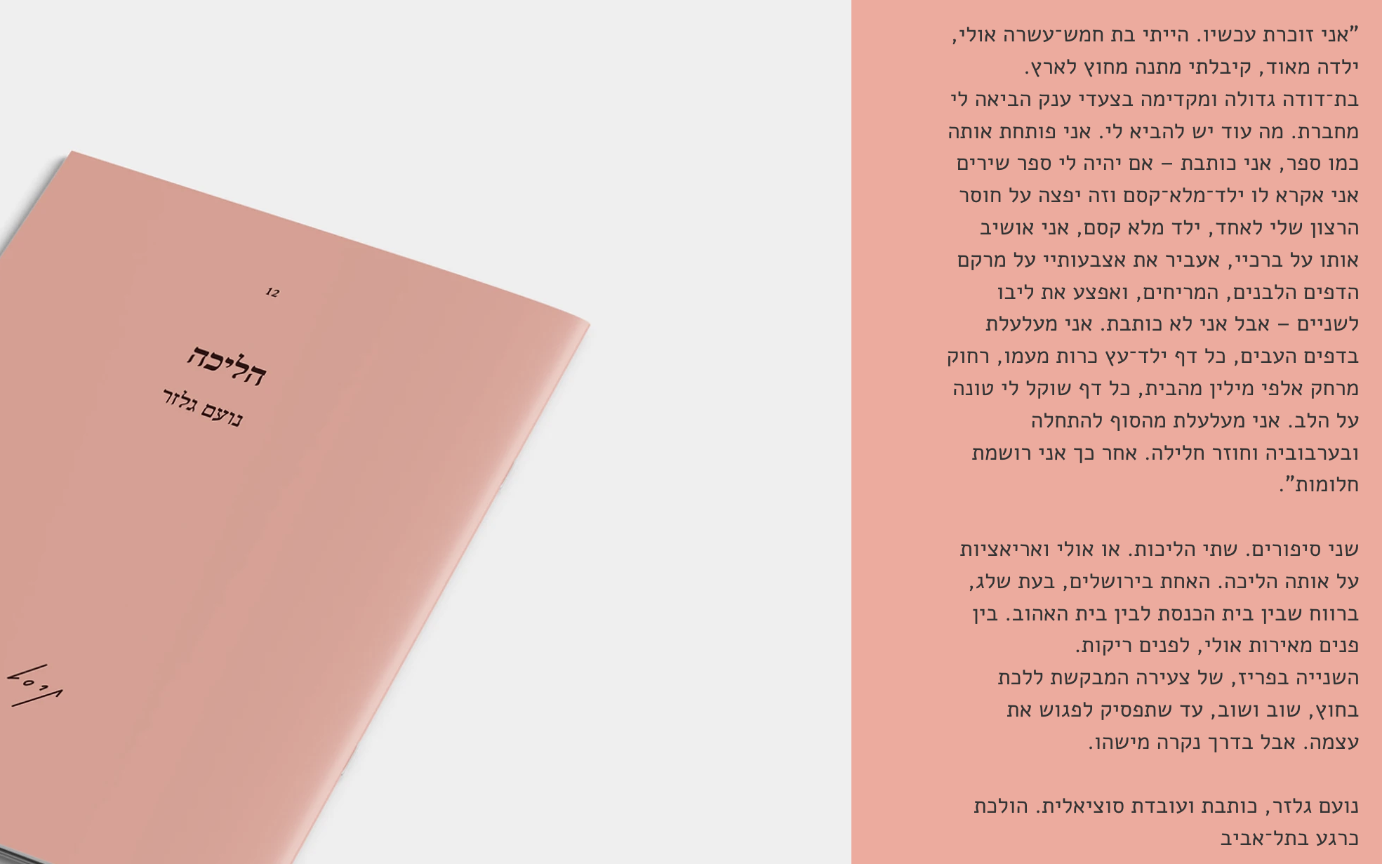 כל מי שמכיר אותי יודע שאני אוהבת ללכת (גם לכתוב). אני מעדיפה הליכה אל יעד מוכר, במסלולים שהעמקתי חפור בהם כבר, או דווקא בהימור על שינויים קלים, בלתי צפויים, המפתיעים גם אותי. אני מעזה, לפעמים, ללכת ללא יעד ברור, שם טמון החשש, אך גם סיכוי למשהו חדש לגמרי.